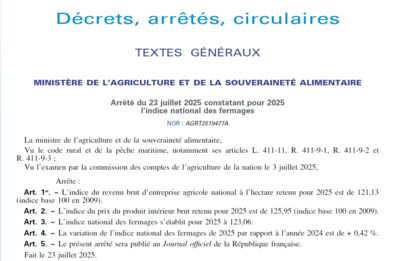 Vous trouverez le détail de l'arrêté dans les DOCUMENTS LIBRES d’accès sous le nom « indice des fermages – arrêté 2025 »