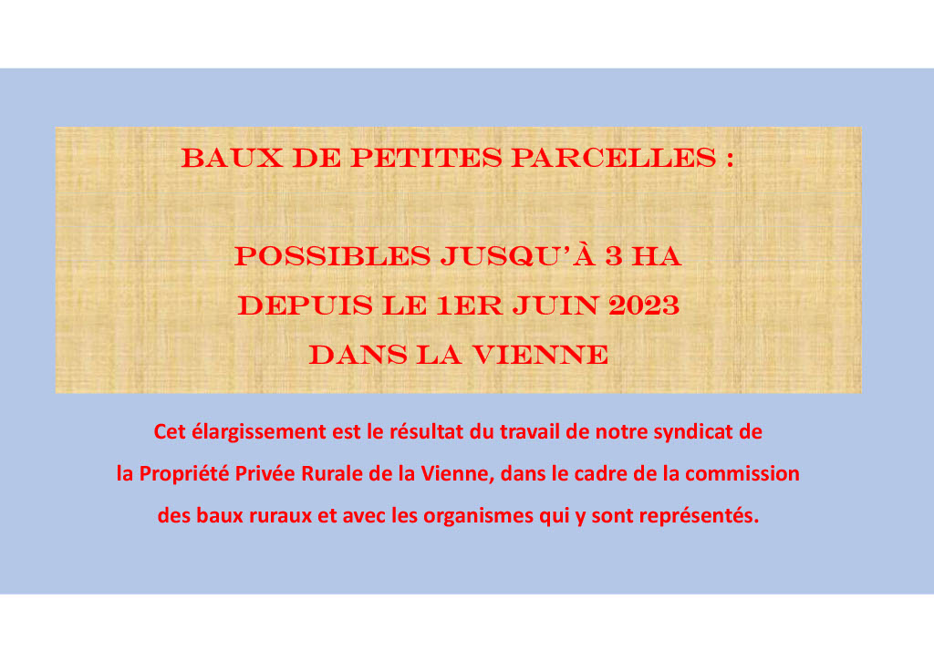 II - De même, nous vous suggérons de consulter le document « Petites parcelles Baux » situé aussi dans la rubrique « Juridique » des documents dans l'espace sécurisé. Vous y trouverez des caractéristiques de ces baux Petites parcelles.