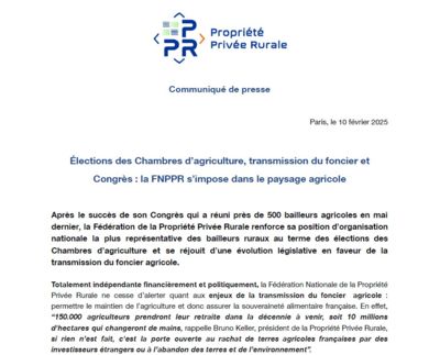 La Fédération Nationale de la Propriété Privée Rurale (FNPPR) renforce son rôle de principal représentant des bailleurs ruraux après le succès de son Congrès et des élections des Chambres d’agriculture. Elle salue une avancée législative favorable à la transmission du foncier agricole, essentielle face au départ en retraite de 150 000 agriculteurs dans la prochaine décennie. La FNPPR plaide pour une meilleure représentativité des bailleurs et se réjouit d’une mesure fiscale dans le PLF 2025 facilitant la transmission du foncier.